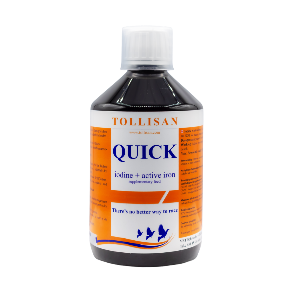 L’ajout de Quick (iode et fer) vous permet d’améliorer les performances des pigeons et assure une bonne fonction de la thyroïde. Cela agit de manière positive sur l’endurance grâce à l’association de l’iode avec le fer. La combinaison avec Dosto-Oregano liquide 12% permet d’obtenir des résultats époustouflants avec les pigeons, en particulier chez les jeunes.